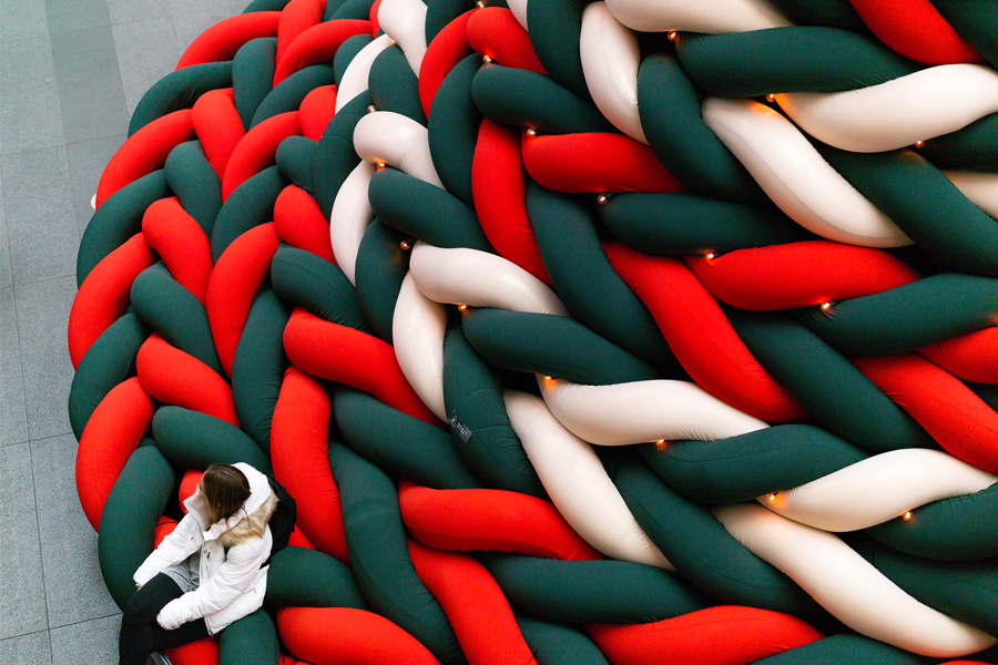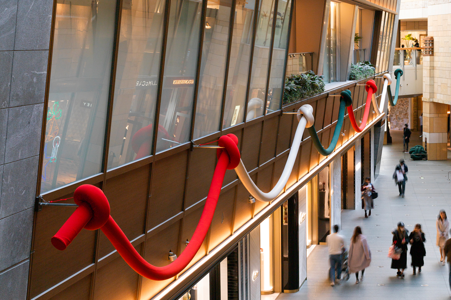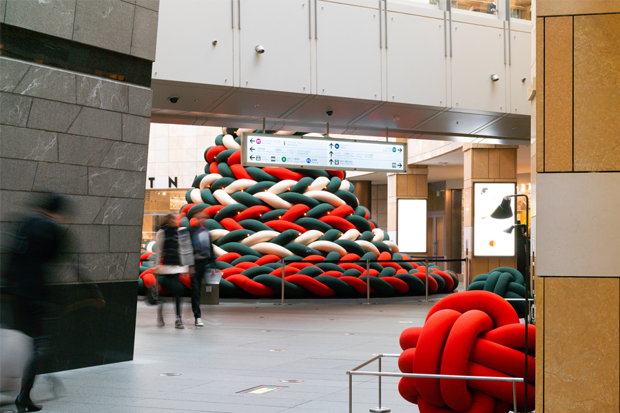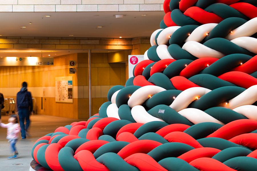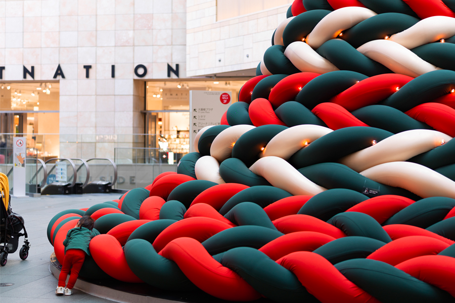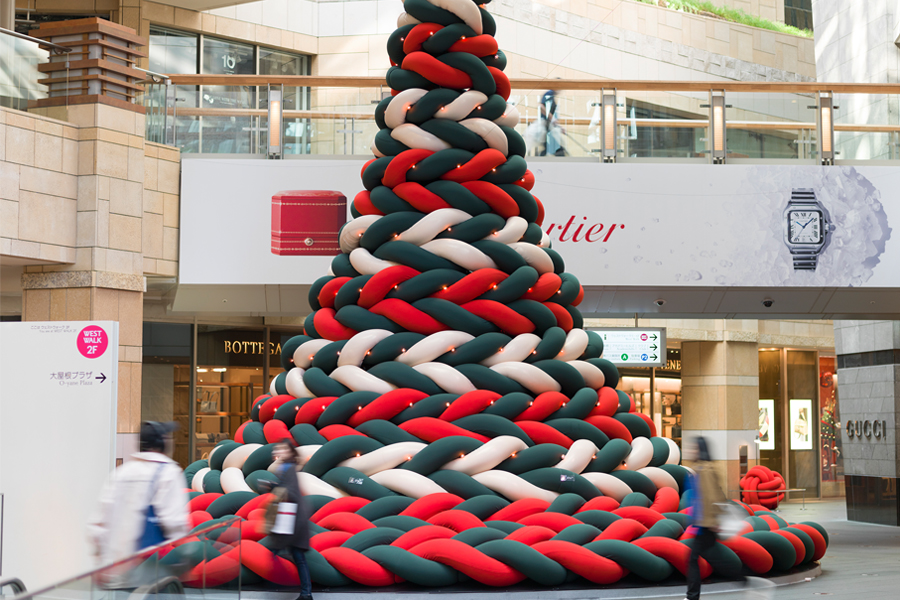 A special “touchable” Christmas tree made from unique knitted fabric for the 2018 Roppongi Hills Christmas illumination. Visitors can sit or lie down and enjoy the soft, cozy texture of the knit. The knitted material also appears throughout West Walk in various forms, enveloping the entire space in warmth.