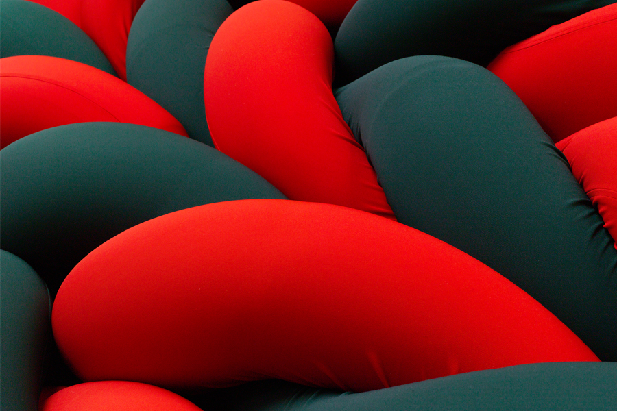 2018年の六本木ヒルズクリスマスイルミネーションのための、特別なニット生地を使用した“触れる”クリスマスツリー。座ったり寝転がったりして、柔らかなニットのさわり心地を楽しめます。ニットはウェストウォーク各所にも形を変えて出現。空間全体をぬくもりで包みます。